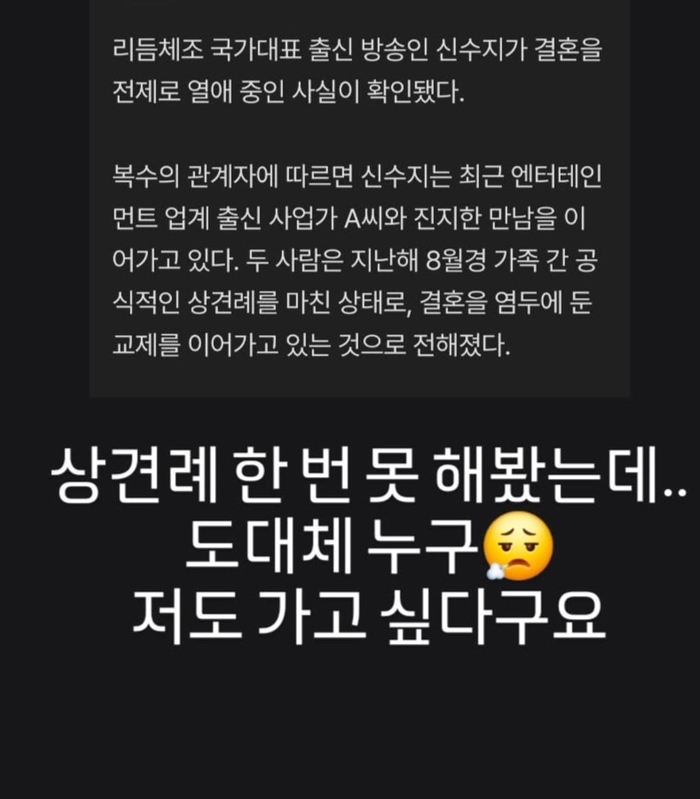 신수지는 28일 자신의 인스타그램 스토리에 “상견례 한 번 못 해봤는데.. 도대체 누구? 저도 가고 싶다구요”라는 문구와 함께 한 매체의 기사 화면을 캡처해 게시했다. 이는 해당 보도가 나온 지 약 1시간 만의 빠른 대응이다.