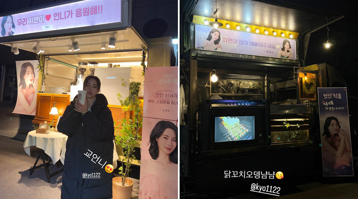 공개된 사진 속에는 송혜교가 임지연의 차기작 ‘멋진 신세계’ 촬영 현장에 보내온 커피차와 간식차의 모습이 담겼다.