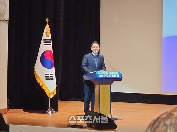 [스포츠서울∣조광태기자] 김영록지사가 29일 해남문화예술회관 대강당에서 열린, 전남광주특별시 행정 교육통합 도민공청회에서 통합추진 방향에 대해서 설명하고 있다.