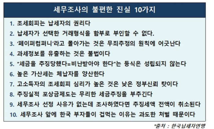 끝으로 한국납세자연맹은 “복잡한 세법과 잦은 개정으로 인한 비의도적 탈세를 고의적 탈세와 동일시해 비난해서는 안 된다”며 “국가 권력의 관점이 아닌 납세자의 권익 보호 관점에서 세무조사를 바라보는 균형 잡힌 시각이 필요하다”고 강조했다.