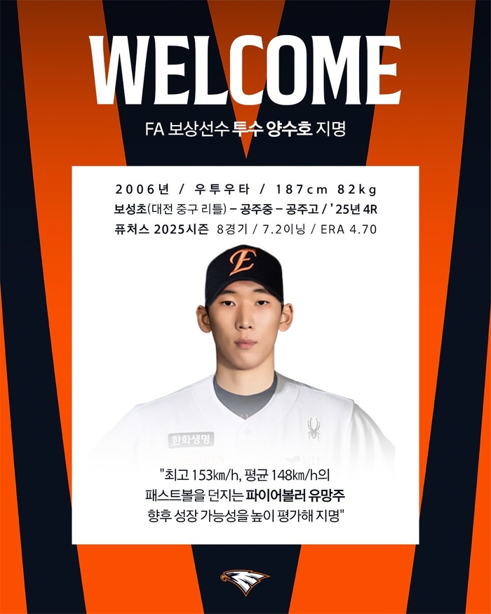 이어 “구단이 성장 고점을 높게 평가하고 있는 선수인 만큼 체격 등 보완점을 개선해 나간다면 향후 김서현, 정우주와 함께 젊은 구위형 투수로 성장할 것이라 기대한다”고 덧붙였다.
