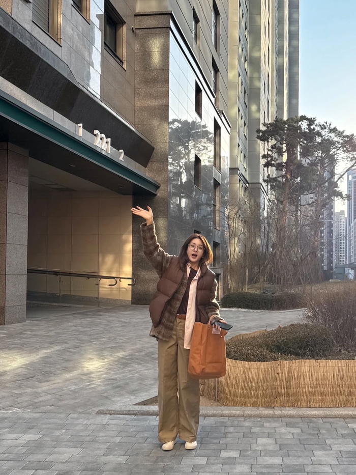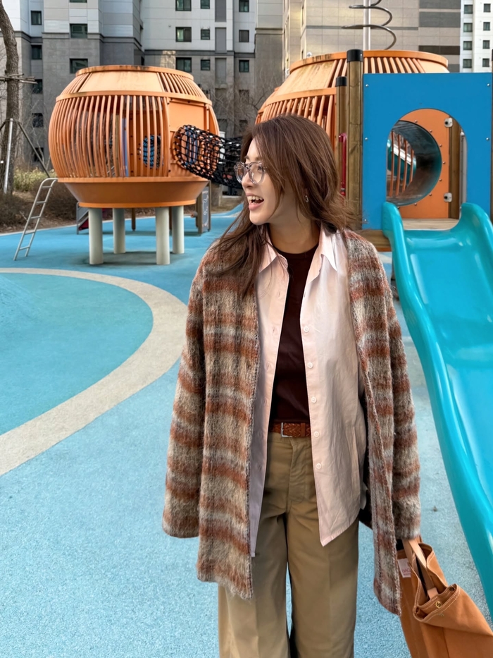 사진 속 강소라는 브라운 톤의 스트라이프 가디건에 베이지 컬러의 와이드 팬츠를 매치해 따뜻하면서도 활동적인 룩을 완성했다.