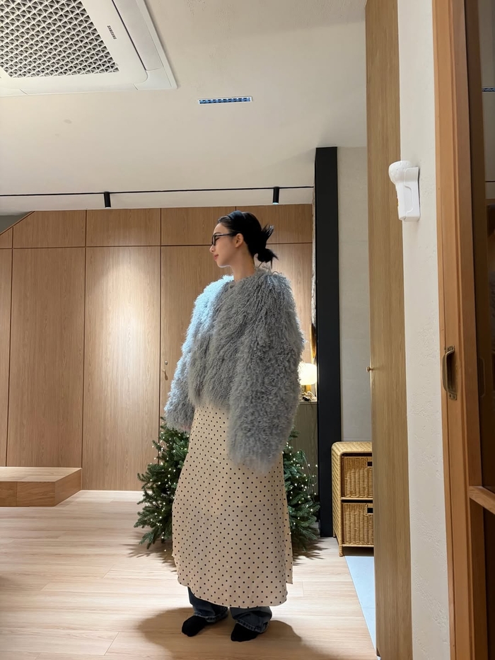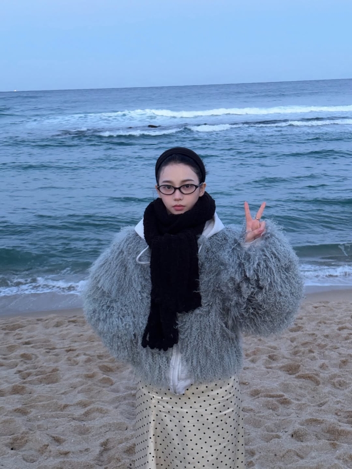 공개된 사진 속 카리나는 회색빛 퍼 자켓과 검은색 목도리를 착용해 포근한 겨울 패션을 선보였다. 특히 평소 무대 위 화려한 모습과는 대조적인 뿔테 안경을 매치해 수수한 매력을 더했다.