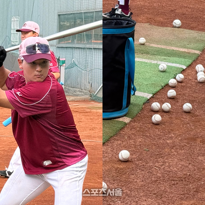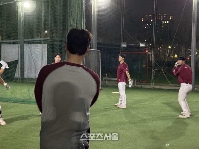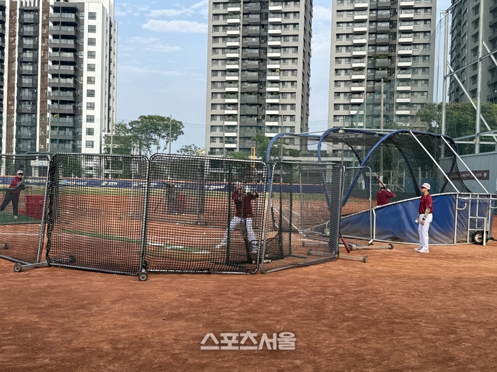외곽 배팅장에서는 ‘중량 배트’를 활용한 라인드라이브 타구 생산에 집중한다. 일반 배트보다 훨씬 무거운 배트로 정면 티배팅을 소화한다. 이는 본훈련에서 일반 배트를 잡았을 때 스윙 궤적이 훨씬 가볍고 날카롭게 돌아가도록 만드는 훈련법이다.
