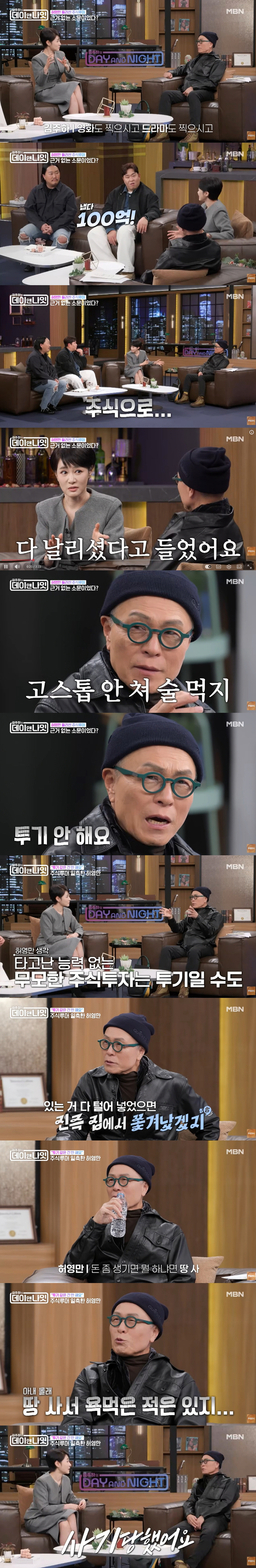 이에 허영만은 “명절이나 제사 때 식구들 모이면 고스톱 안 친다. 술 마신다. 투기 안 한다”며 “주식 투자를 하는 사람은 태어날 때부터 타이밍을 놓치지 않는 사람들이다. 공부를 많이 해서 되는 게 아니고 투기를 할 만큼 타고 나야 한다”고 주식 투자 소문을 일축했다.