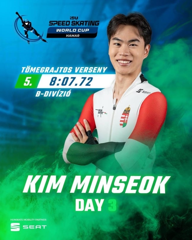 2018 평창과 2022 베이징 대회 스피드 스케이팅 남자 1500m에서 동메달을 목에 건 김민석은 헝가리 국가대표로 이번 대회에 참가한다. 올림픽 참가 확정 직후 그는 축구대표팀 ‘캡틴’ 손흥민(LAFC)의 상징과 같은 ‘찰칵 세리머니’를 따라한 사진을 공개해 눈길을 끌었다.