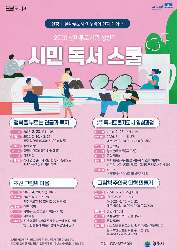 참여 신청은 도서관 누리집(lib.wonju.go.kr/sm)에서 선착순으로 접수한다. 자세한 사항은 샘마루도서관(☎033-737-5494)으로 문의하면 된다.