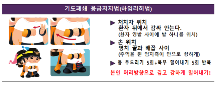 소방청은 만일의 사고에 대비해 평소 기도폐쇄 응급처치법인 ‘하임리히법’을 익혀두고, 기도막힘 증상으로 호흡곤란 등이 발생할 경우 신속하게 응급처치를 시행해야 한다고 강조했다.