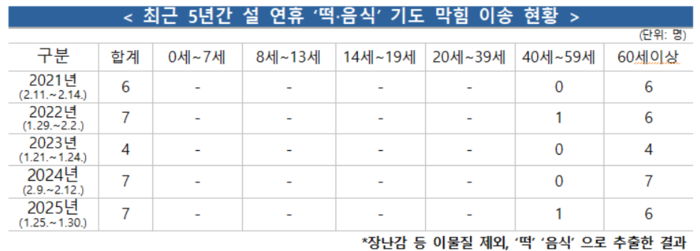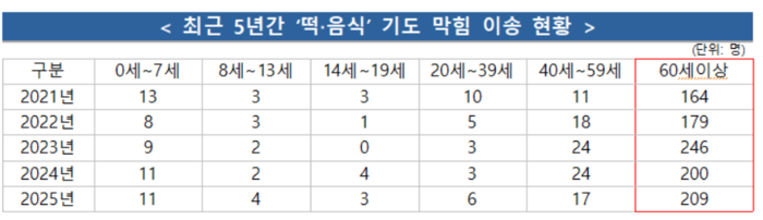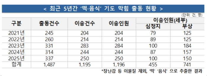 소방청 구급통계 자료에 따르면 최근 5년(2021년~2025년) 간 떡, 음식 등으로 인한 기도 막힘 사고로 출동한 건수는 총 1,487건이며, 이송인원은 1,196명으로 연평균 239명이 병원으로 이송된 것으로 나타났다.
