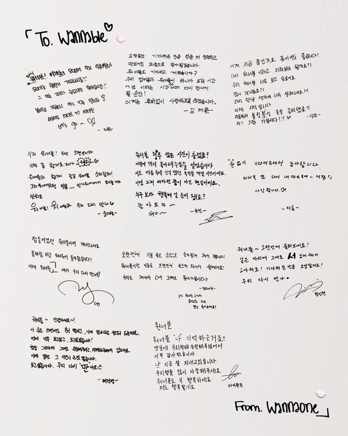 하성운은 “이게 지금 꿈인가. 꿈이어도 좋다. 워너블이라고 다시 외쳐봐도 되겠냐. 너무 보고 싶었다”라고 벅찬 마음을 드러냈고, 윤지성은 “그리웠던 만큼 반가워해 줄 거라 믿는다”고 전했다.