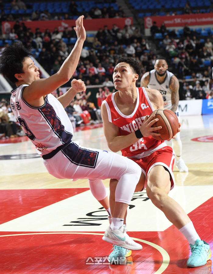 KCC 허웅(왼쪽)이 2일 잠실학생체육관에서 열린 2025-2026 프로농구 SK와 경기에서 SK 에디 다니엘을 수비하다 충돌하며 넘어지고 있다. 2026. 2. 2.