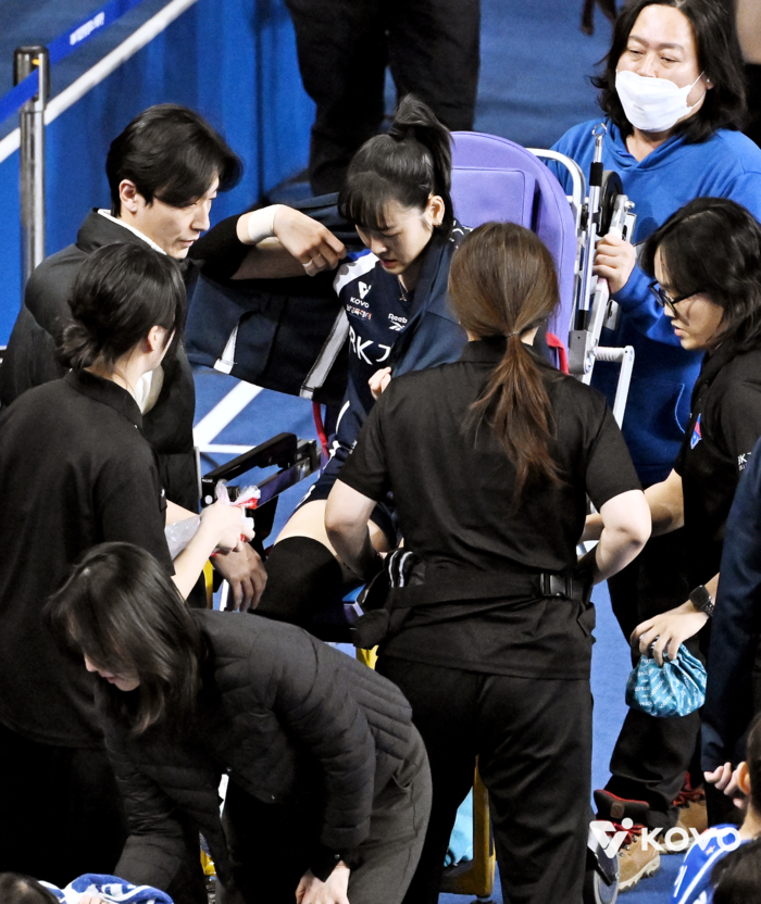1세트 중반 기업은행은 대형 변수에 직면했다. 베테랑 리베로 임명옥이 세트 중반 오른쪽 발목 부상으로 쓰러졌다. 더 이상 경기를 소화할 수 없는 상황이라 곧바로 병원으로 이송됐다. 대신 김채원이 공백을 메웠다.