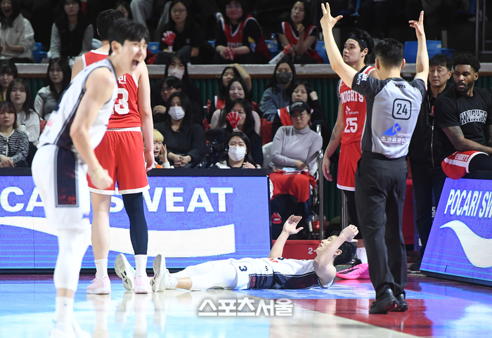 KCC 허웅(가운데)이 2일 잠실학생체육관에서 열린 2025-2026 프로농구 SK와 경기에서 3점슛으로 50 득점을 달성하고 파울까지 얻어낸 뒤 코트에 넘어져있다. 허웅은 추가 자유투까지 성공하며 경기 51 득점을 기록했다. 2026. 2. 2.