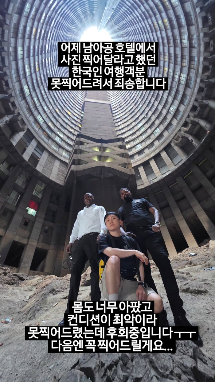 이어 “어제 남아공 호텔에서 사진 찍어달라고 했던 한국인 여행객분, 못 찍어드려서 죄송합니다”라며 운을 뗐다. 이어 “당시 몸이 너무 아팠고 컨디션이 최악이라 거절했는데, 이후 계속 후회가 된다. 다음엔 꼭 찍어드리겠다”라고 덧붙이며 미안함을 전했다.