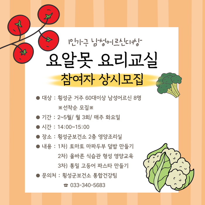 [스포츠서울ㅣ김기원기자]횡성군은 1인가구 남성 어르신의 건강한 식생활 형성과 영양관리 강화를 위해 2월부터 5월까지 ‘요알못(요리를 알지 못하는) 영양교실’을 운영한다.