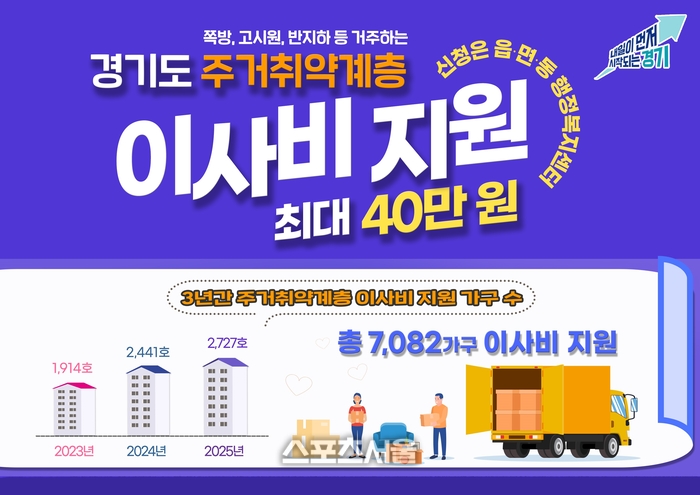 〔스포츠서울│수원=좌승훈기자〕경기도는 쪽방, 고시원, 반지하 등 열악한 주거환경에 거주하고 있는 주거취약계층의 안정적 이주를 위해 올해도 ‘주거취약계층 이사비 지원사업’을 이어간다고 4일 밝혔다.