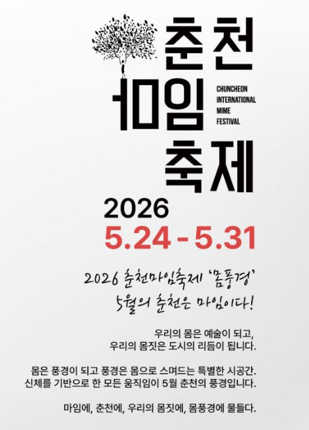 2026년 5월 24일(일)부터 31일(일)까지 개최되는 제38회 춘천마임축제는 ‘몸풍경’을 주제로 펼쳐진다. 개막난장 아!水라장을 시작으로 걷다보는마임, 예술난장 X, 밤샘난장 도깨비난장 등 다양한 프로그램이 춘천시 전역에서 진행될 예정이다. 축제에 대한 자세한 내용은 춘천마임축제 공식 홈페이지(www.mimefestival.com)를 통해 공개될 예정이다.
