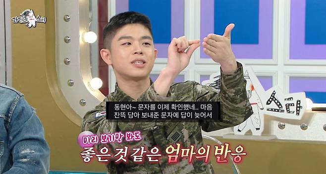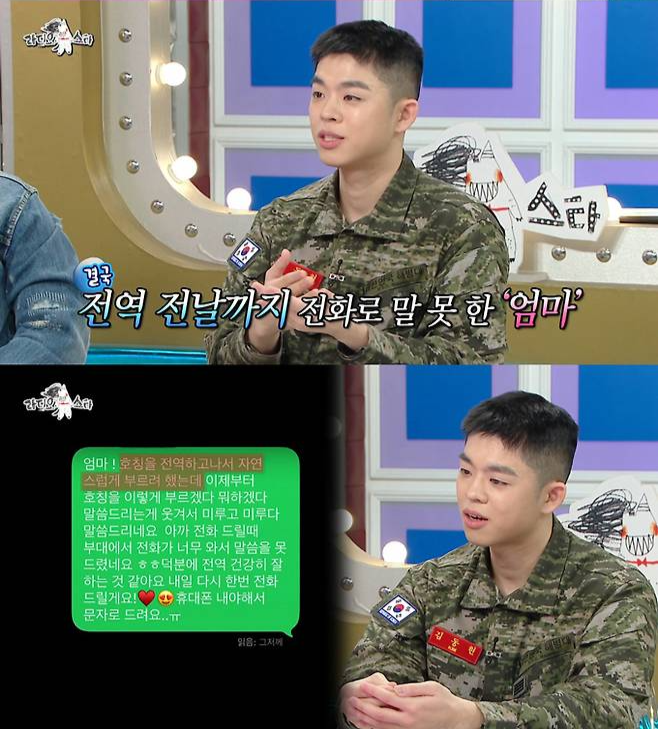 그리는 “전역 전날이 됐다. 근데 아직까지도 엄마라고 부르질 못 했다. 용기내 전화를 드렸는데 안 받으시더라. 그런데 휴대폰을 9시에 내야 한다. 55분까지 기다렸는데 안 받으셔서 문자를 보냈다”고 밝혔다.