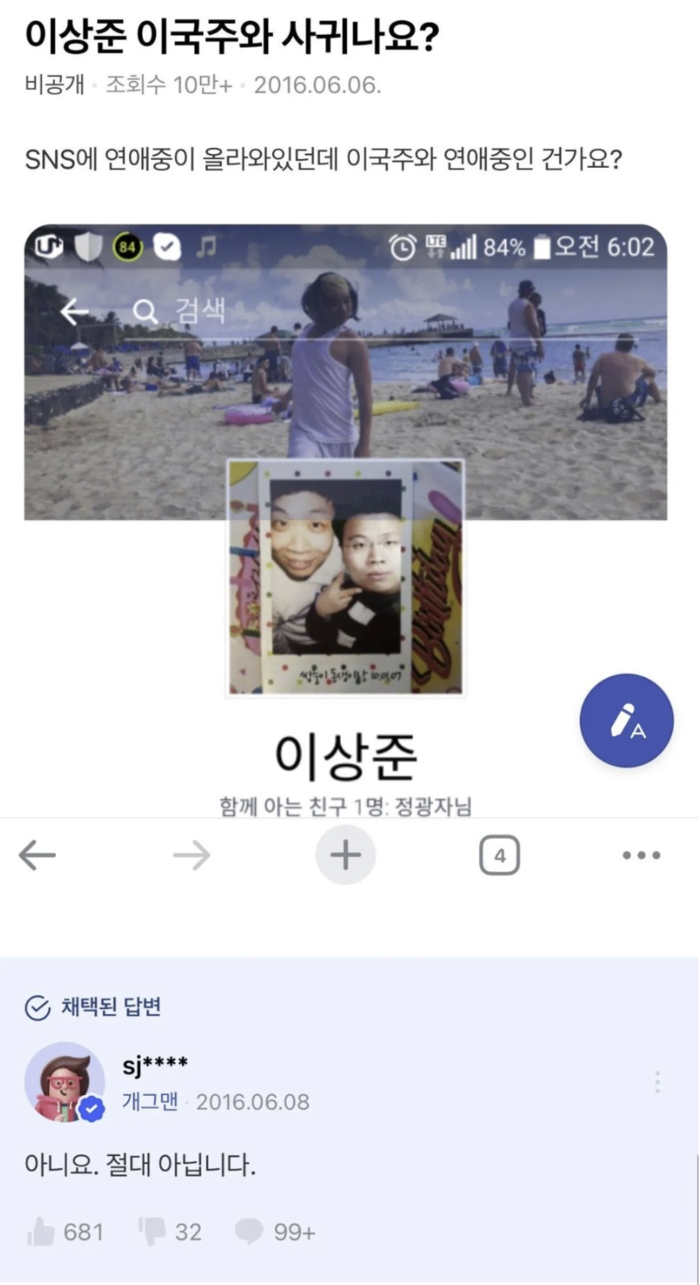 해당 질문은 2016년 6월 6일 작성된 글로 “SNS에 연애중이 올라와있던데 이국주와 연애중인 건가요”라는 내용이 담겼고, 이상준은 이틀 후인 6월 8일 직접 등판해 “아니요. 절대 아닙니다”라며 극구 부인하는 답변을 달아 웃음을 자아냈다.