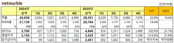 넷마블은 지난해 4분기와 연간 실적에서 분기·연간 기준 사상 최대 매출을 기록했다. 2025년 4분기 연결 기준 매출 7976억원, 영업이익 1108억원으로 집계됐다. 전년 동기 대비 매출은 22.9%, 영업이익은 214.8% 급증했다. EBITDA(상각전 영업이익) 역시 1489억원으로 두 배 이상 성장했다.