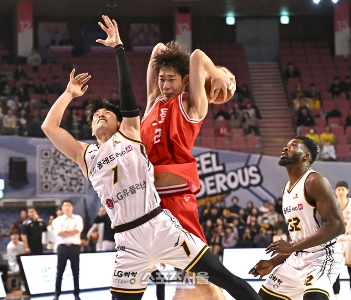 서울 삼성 이원석이 5일 서울 잠실실내체육관에서 열린 2025~2026 프로농구 창원 LG와 경기에서 상대 유기상에 앞서 루스볼을 차지하고 있다.