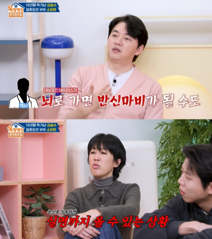 김승수는 “의사가 대상포진 바이러스가 뇌로 가면 반신마비가 될 수도 있고, 눈으로 침투하면 실명이 올 수 있다더라. 그런데 선생님이 각막까지 침투한 것 같다고 했다”며 심각했던 상황을 회상했다.