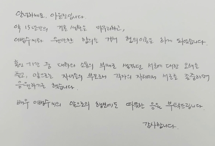 이어 “혼인 기간 중 대화와 소통의 부재로 생겼던 서로에 대한 오해를 풀고 앞으로는 자녀들의 부모로서 각자의 자리에서 서로를 존중하며 응원하기로 했습니다”라고 적었다.