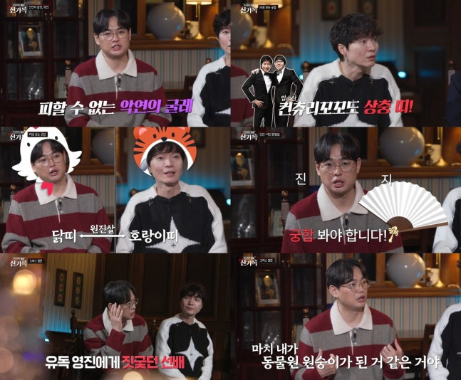 이날 방송에서 띠별 궁합 테스트가 공개돼 눈길을 끌었다. 특히 신정환은 과거 컨츄리꼬꼬 시절 함께했던 탁재훈과의 관계에는 정반대 성향으로 만나기만 하면 부딪친다는 이른바 ‘상충살’이, 현재 호흡을 맞추고 있는 박영진과의 관계에는 서로 미워한다는 ‘원진살’이 나타나 경악을 금치 못했다. 하지만 원진살은 일명 ‘사랑살’이라 하여, 쉽게 끊을 수 없는 애증의 관계라는 해석이 더해져 위기를 맞은 두 사람의 관계가 어떻게 변화할지 관심이 쏠린다.