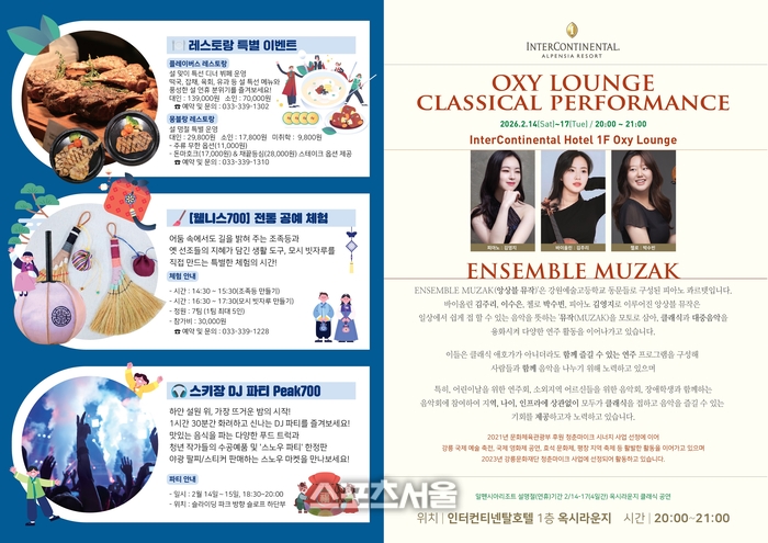 이번 설날 이벤트는 ▲투숙객 대상 경품 이벤트 ▲체크인 고객 미니 캘린더 증정 ▲스포츠 레저 시설 이용 혜택 ▲PEAK700 DJ SLOPE PARTY ▲옥시 라운지 클래식 라이브 공연 ▲SNS 인증샷 이벤트 ▲레스토랑 특별 이벤트 ▲웰니스700 전통 공예 체험 등 다채로운 프로그램으로 구성됐다.