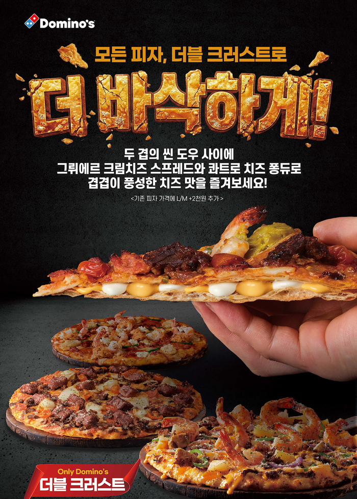 도미노피자의 ‘더블 크러스트 도우’는 두 장의 씬 크러스트 도우 사이에 그뤼에르 크림치즈 스프레드와 콰트로 치즈 퐁듀를 넣어 크러스트의 바삭한 식감과 치즈의 풍부한 맛을 가진 도우다.