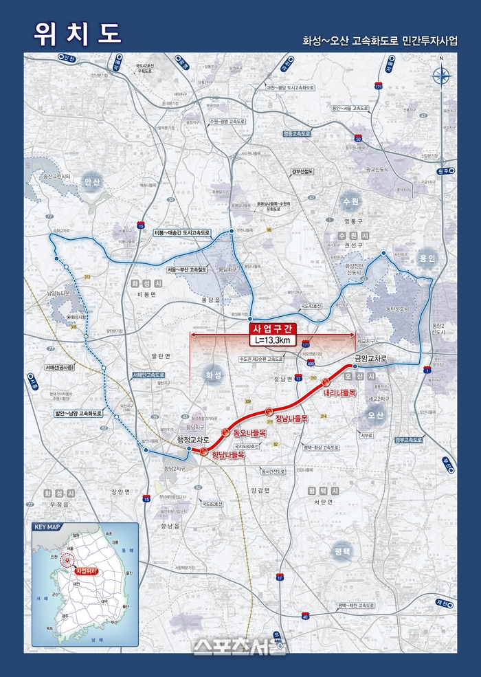 7일 시에 따르면 이 사업은 화성시 향남읍에서 오산시 금암동까지 약 13.3km 구간을 연결하는 왕복 4차로 자동차전용도로를 건설하는 것으로, 개통 시 수도권 서남부 지역의 교통 혼잡 해소와 이동 시간 단축, 산업·주거지역 접근성 개선에 크게 기여할 것으로 기대된다.