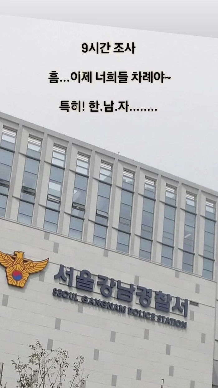 이후 A씨는 기존에 올렸던 게시물을 삭제하고 인스타그램 스토리에 서울 강남경찰서 사진을 게재했다. 이와 함께 “9시간 조사. 흠... 이제 너희들 차례야. 특히! 한.남.자........”라는 의미심장한 문구를 덧붙여 특정 남성을 향한 본격적인 대응을 예고했다.