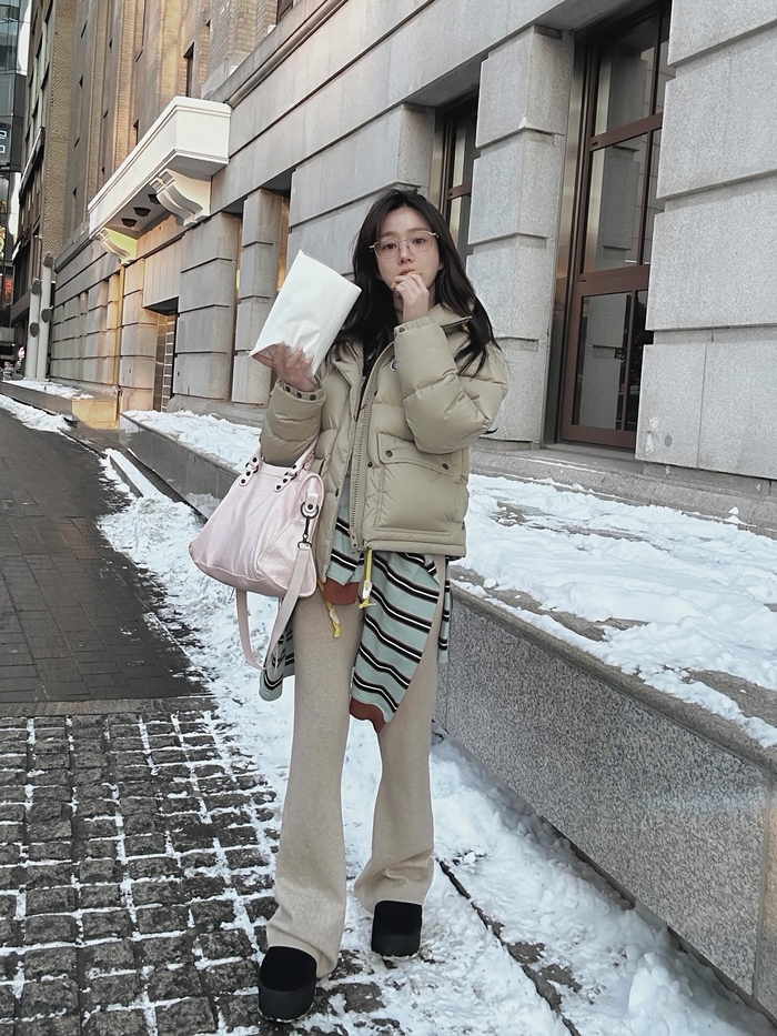 이유비의 일상 패션과 미모도 빛을 발했다. 베이지색 패딩 점퍼에 안경을 매치한 편안한 룩을 선보였으나, 이유비 특유의 투명한 피부와 인형 같은 이목구비는 오히려 도드라진다. 스트라이프 니트를 허리에 묶고 세련된 패션 감각을 보여줬으며, 핑크색 백에 매치한 귀여운 인형 키링도 시선을 사로잡는다.