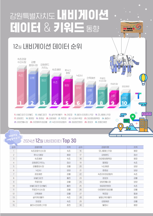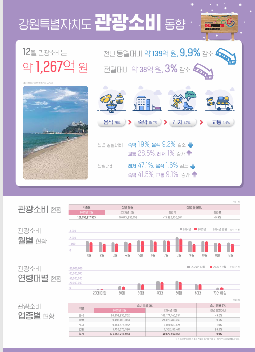 또한, 2025년 1월 개통한 KTX 동해중부선(이하 동해선) 개통에 힘입어, 전년 대비 부·울·경 지역 유입 관광객은 약 7.7% 증가한 것으로 나타났다. 강원 지역으로 유입되는 광역지자체 가운데 경상북도가 5위(3.7%)를 차지했으며, 전년 대비 유입률 증가폭이 큰 광역지자체로는 울산(12.4%, 1위), 부산(12.3%, 2위), 경상남도(9.4%, 3위) 등이 차례로 포함되며 동해선 열차권역 광역지자체 방문객이 크게 증가한 것으로 확인됐다.