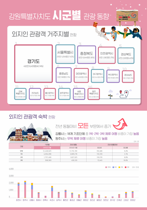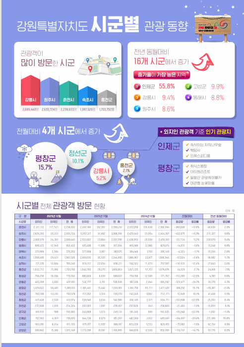 시군별 관광 현황의 경우, 철원을 제외한 17개 시군에서 전년 대비 관광객이 증가했으며, 그 중 인제군이 가장 높은 관광객 증가율(12.0%)을 기록하였고, 이어서 홍천군(8.8%), 동해시(6.7%), 영월군(6.0%), 고성군(5.7%) 등 순으로 관광객 증가세를 보였다.