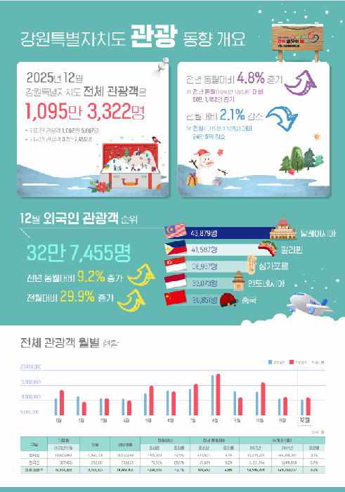 [스포츠서울ㅣ춘천=김기원기자]강원관광재단(대표이사 최성현)은 빅데이터 기반의 강원관광 동향분석을 통해 강원특별자치도를 방문한 2025년 전체 관광객은 전년 대비 약 480만 명(3.2%) 증가한 약 1억 5,460만 명이라고 밝혔다.외지인 관광객은 전년 대비 약 462만 명(3.2%), 외국인 관광객은 약 18만 명(5.7%) 증가하여 내·외국인 모두 강원 관광 수요가 상승 추세를 보이는 것으로 나타났다.