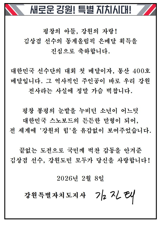 축전을 받은 김상겸 선수는 “강원도의 지속적인 지원 덕분에 이 자리에 설 수 있었고, 한마음으로 응원해주신 강원도민 여러분께도 진심으로 감사드린다”라고 화답했다.