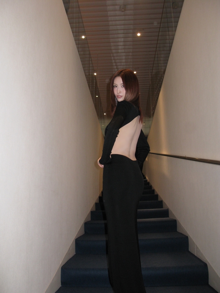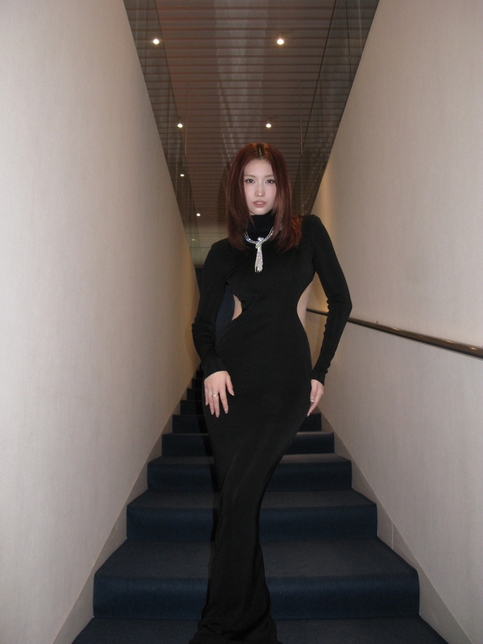공개된 사진 속 모모는 몸매 라인이 고스란히 드러나는 밀착 블랙 롱 드레스를 입고 계단 위에서 포즈를 취하고 있다.