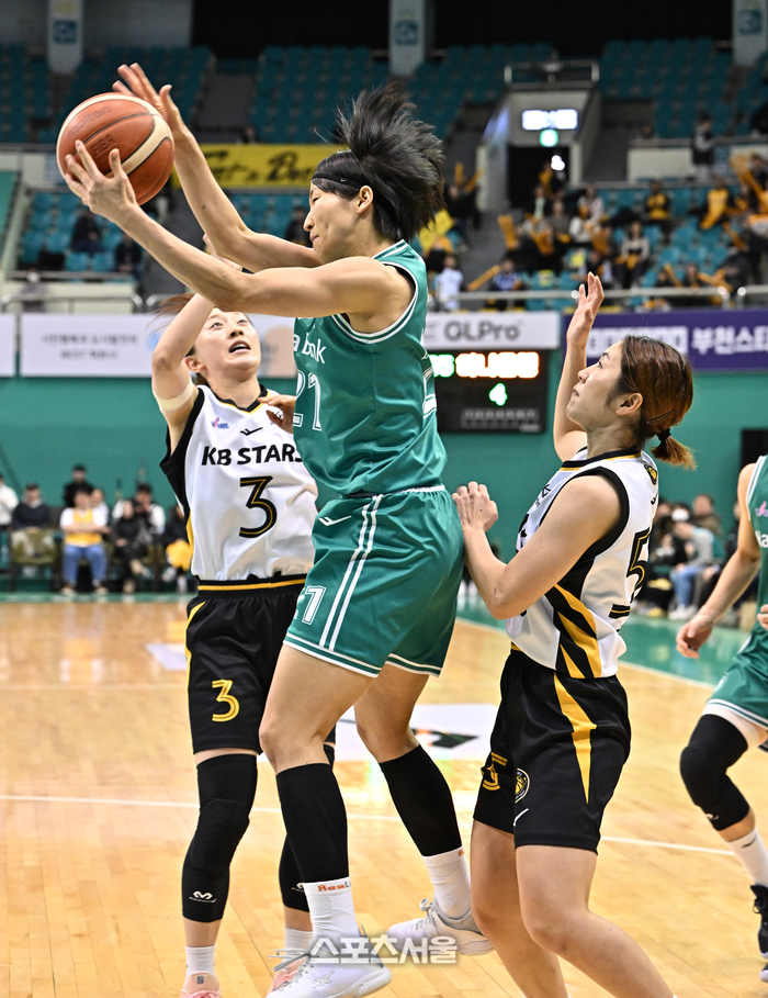 하나은행 이이지마 사키(가운데)가 9일 부천체육관에서 열린 2025-2026 여자프로농구 KB스타즈와 경기에서 공격 리바운드를 하고 있다. 2026. 2. 9.