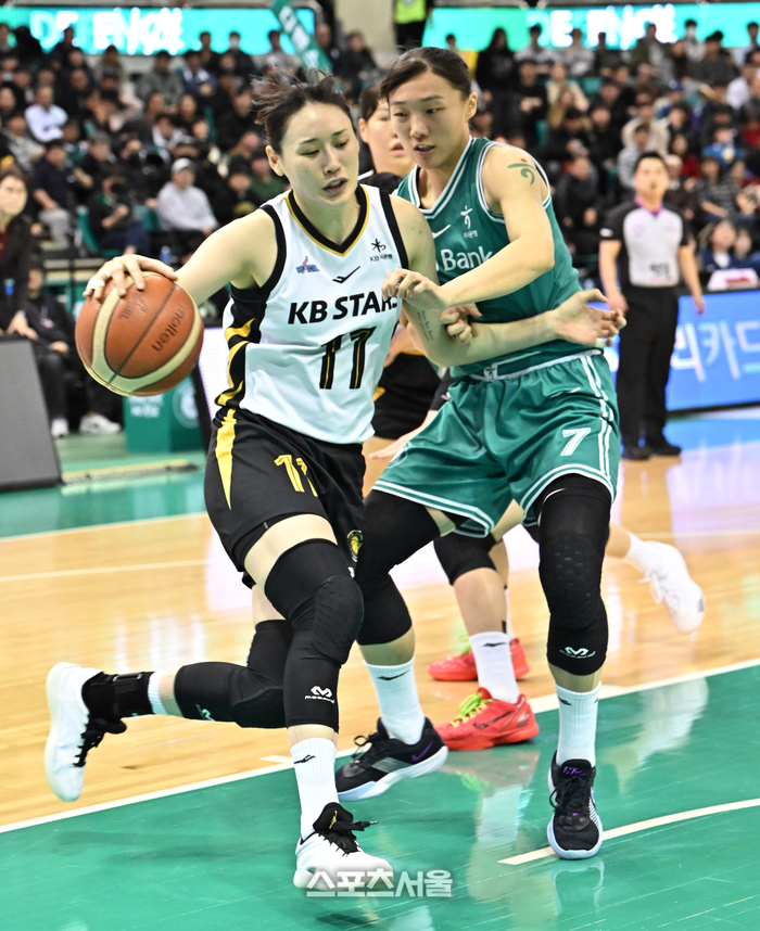 KB스타즈 강이슬(왼쪽)이 9일 부천체육관에서 열린 2025-2026 여자프로농구 하나은행과 경기에서 골밑 공격을 하고 있다. 2026. 2. 9.