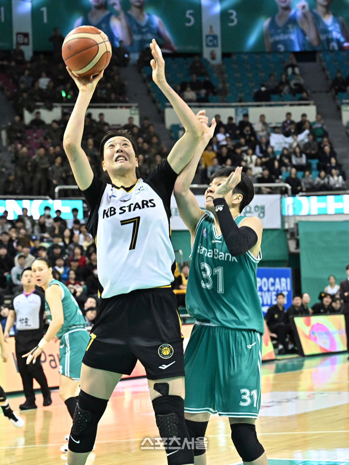 KB스타즈 박지수(왼쪽)가 9일 부천체육관에서 열린 2025-2026 여자프로농구 하나은행과 경기에서 하나은행 진안의 수비를 피해 골밑슛을 하고 있다. 2026. 2. 9.