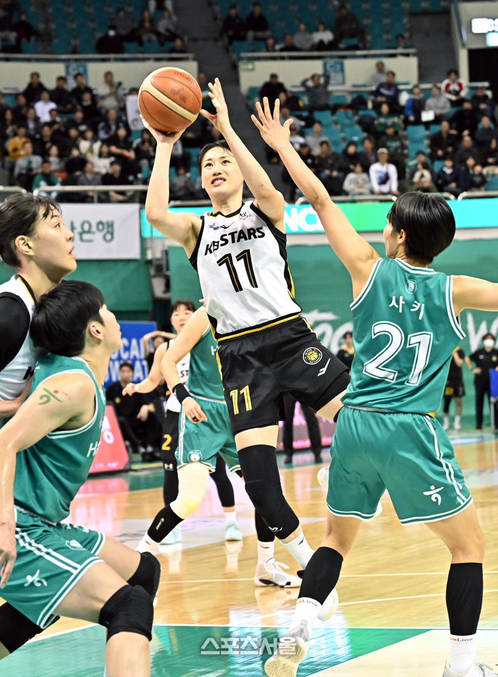KB스타즈 강이슬(가운데)가 9일 부천체육관에서 열린 2025-2026 여자프로농구 하나은행과 경기에서 하나은행 사키의 수비를 피해 골밑슛을 하고 있다. 2026. 2. 9.
