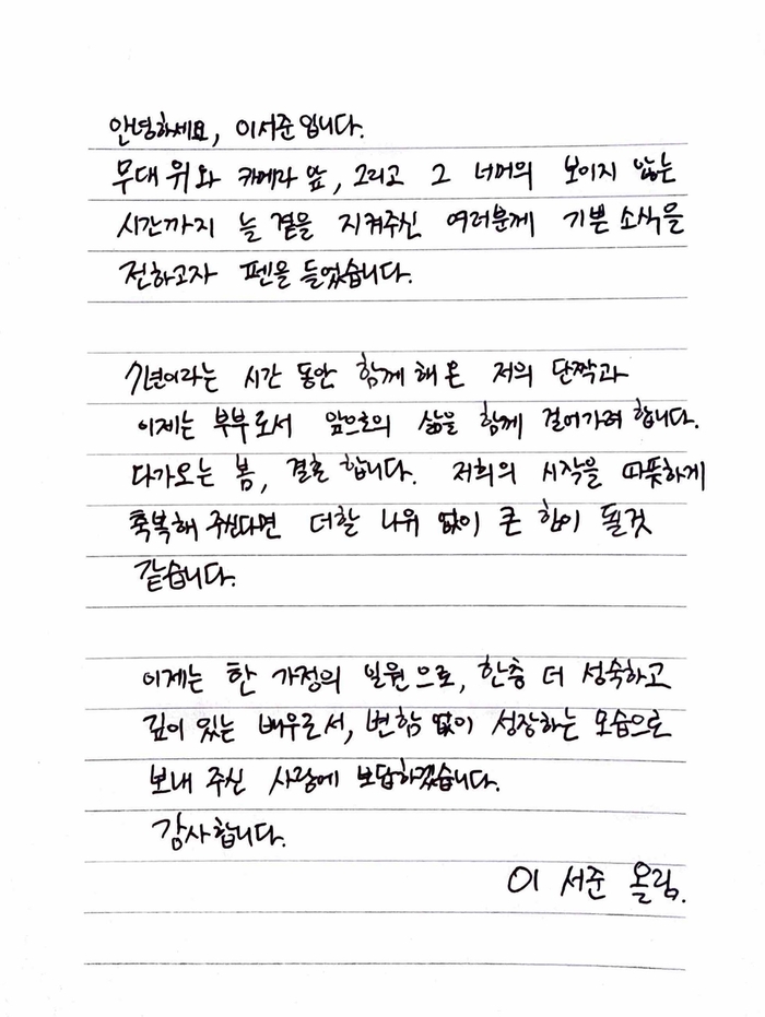 이서준은 9일 자신의 SNS를 통해 정성스럽게 적은 자필 편지를 공개하며 팬들에게 결혼 소식을 직접 알렸다.