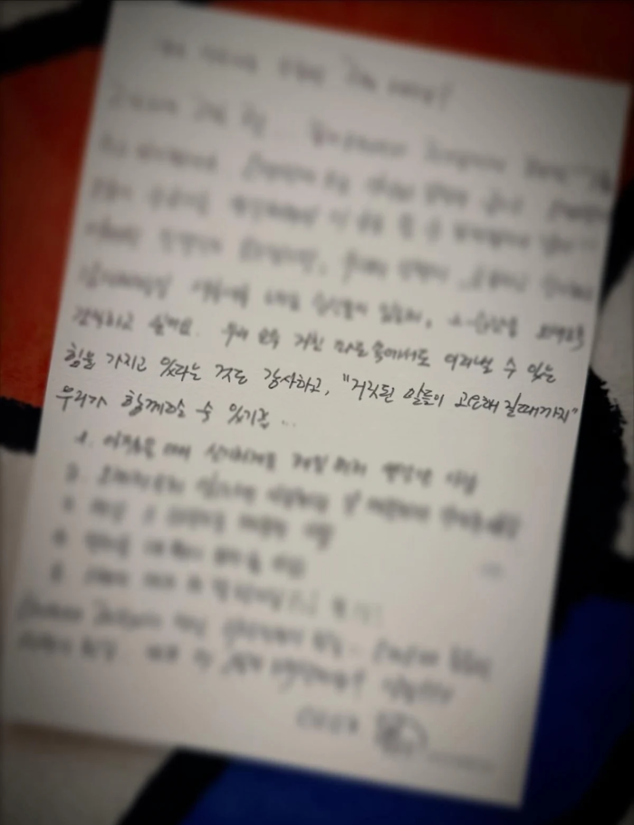 그는 공연 후 받은 편지 중 일부를 공개했다. 편지에는 ‘우리 모두 거친 파도 속에서도 이겨낼 수 있는 힘을 가지고 있다는 것도 감사하고 거짓된 말들이 고요해질 때까지 우리가 함께 할 수 있기를’이라고 적혀 있어 눈길을 끌었다.