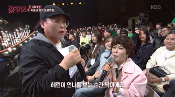 그는 직접 이상형을 고르겠다며 “연상이어도 괜찮다. 10살 정도?”라며 조혜련에게 다가갔다. 방청객은 “언니를 보는 순간 딱”이라고 말했고, 조혜련은 “저는 벌써 두 번을 해가지고요”라며 당황한 기색을 내비치며 웃음을 안겼다.