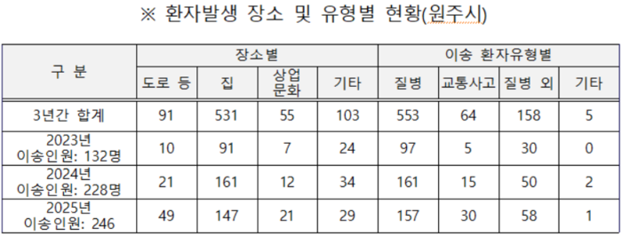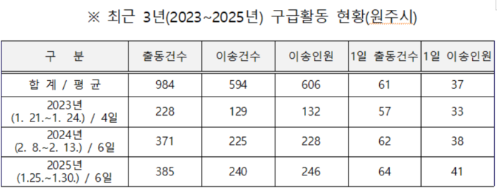 최근 3년간(2023년~2025년) 설 명절 기간 원주 지역 구급출동 현황을 분석한 결과, 119구급차가 총 984건 출동해 606명의 환자를 병원으로 이송해 하루 평균 61건 출동해 37명을 이송한 것으로 타나났다. 1일 평균 구급출동 건수와 이송이원도 매년 소폭 증가하는 추세를 보였다.