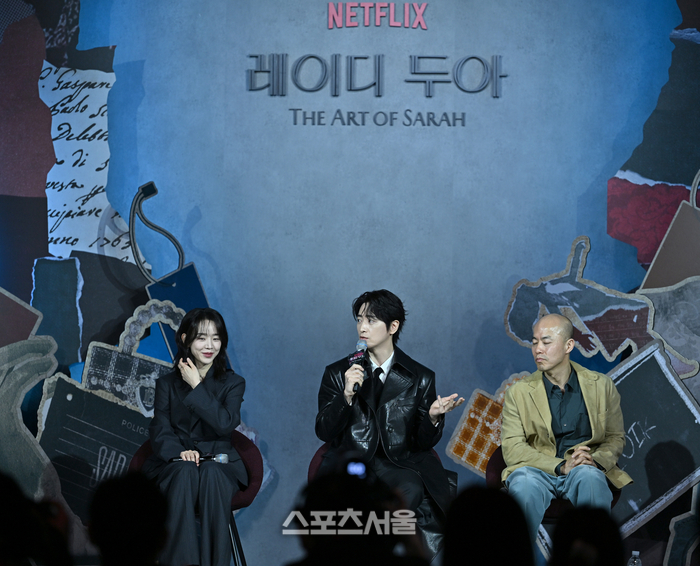 이준혁이 10일 앰배서더 서울 풀만 호텔에서 열린 넷플릭스 시리즈 ‘레이디 두아’ 제작발표회에서 기자의 질문에 답하고 있다.
