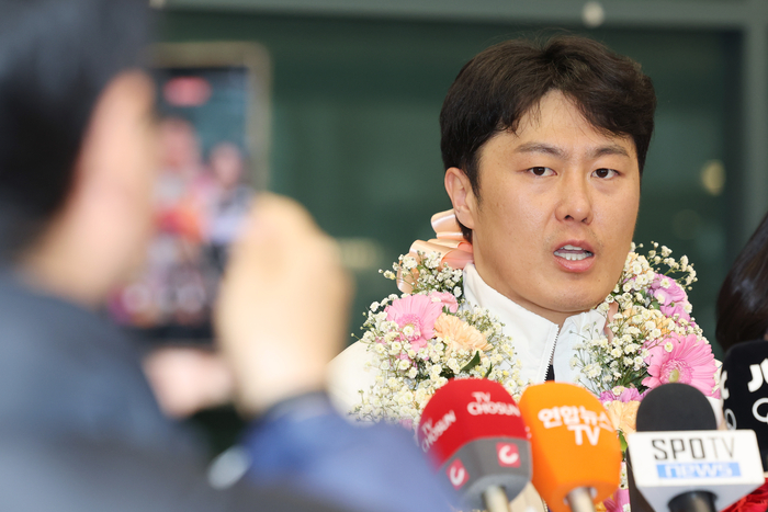 김상겸(37·하이원)이 10일 인천공항을 통해 2026 밀라노·코르티나 동계올림픽 남자 평행대회전에서 은메달을 목에 걸고 ‘금의환향’했다. 한국 선수단에 선사한 첫 번째 메달이기도 하다. ‘포기를 모르는 남자’라는 내용이 걸린 플래카드가 그를 반겼고, 아내 김한솔 씨도 꽃다발을 들고 남편을 마중 나와 인터뷰도 함께 했다.