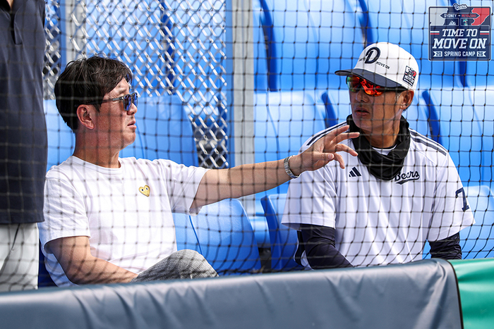 10일(한국 시간) 호주 시드니 블랙타운 야구장. 이날은 WBC 최종 엔트리에 승선한 곽빈의 첫 번째 라이브피칭 날이었다. 두산 코치진의 관심이 쏠릴 수밖에 없던 날. 관중석 김원형 감독 옆자리에 낯익은 얼굴이 보였다. 류 감독이다.