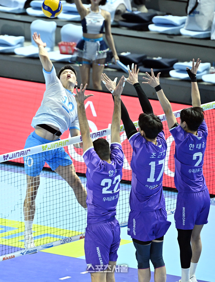 대한항공 정지석(왼쪽)이 10일 인천 계양체육관에서 열린 2025-2026 V리그 남자부 우리카드와 경기에서 스파이크 공격을 하고 있다. 2026. 2. 10.